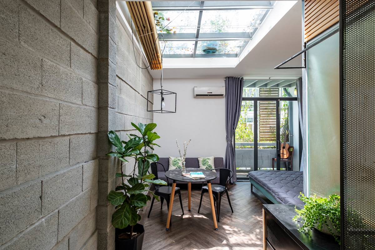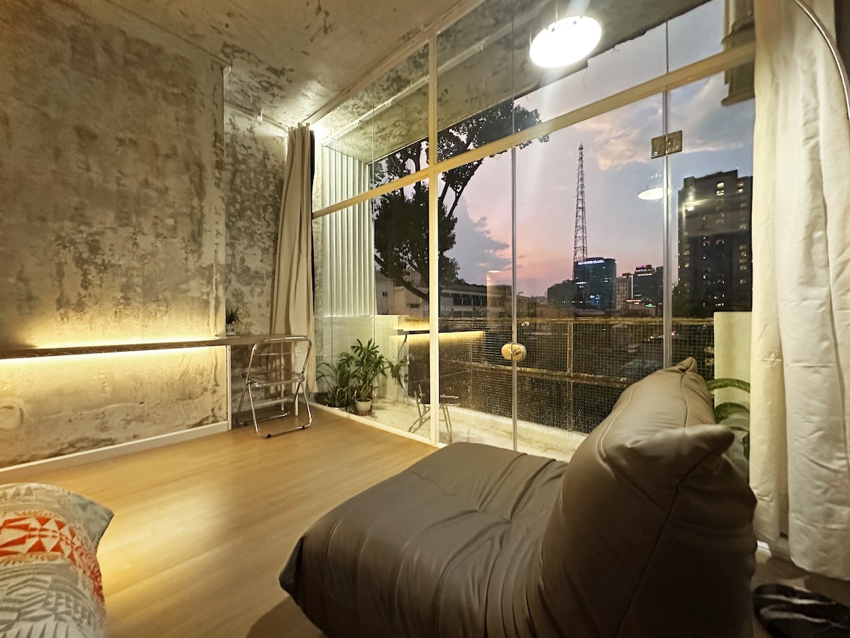 Toto jedinečné ubytování je navrženo pro luxusní zážitek ve velkém stylu. Díky chytrým posuvným dveřím jsou váš obývací pokoj a ložnice snadno propojeny, aby se maximalizoval prostorný dům o rozloze 50 m2. Při procházce po mostě BaSon mezi kondominiem a D1 můžete cítit vánek řeky Saigon a nádherný výhled na město. Do centra města se dostanete za pouhých 5 až 10 minut taxíkem.
