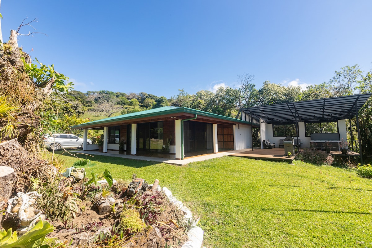Tento dům stojící na 6hektarové farmě byl nedávno postaven jako útočiště v přírodě – klidné útočiště obklopené bujnou zelení, zvlněnými kopci a nádherným výhledem na Nicoyanský záliv. Jakmile dorazíte, pocítíte klid kostarického oblakového lesa. Nechte své uši naladit na zpěv ptáků a občasné opičí povídání ve stromech… Toto je místo pro odpočinek, opětovné spojení a inspiraci – ať už sleduješ úchvatné západy slunce z terasy nebo se vydáš na procházku po místní stezce.