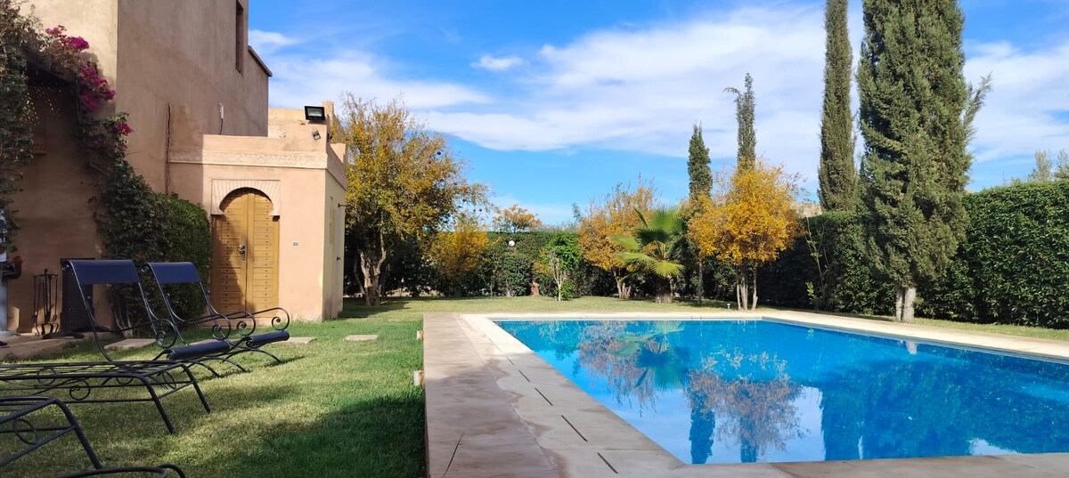 Objev tuto krásnou vilu se soukromým bazénem, která se nachází v srdci zalesněné zahrady bez přímého souseda, jen 40 km od Marrákeše. Útočiště klidu, kam cestovatelé a rodiny jezdí dobít energii, nasát slunce a užít si úplnou změnu prostředí. Mezi pohodlím, soukromím a přírodou je to ideální místo pro nezapomenutelnou dovolenou, která kombinuje klid a blízkost k červenému městu.