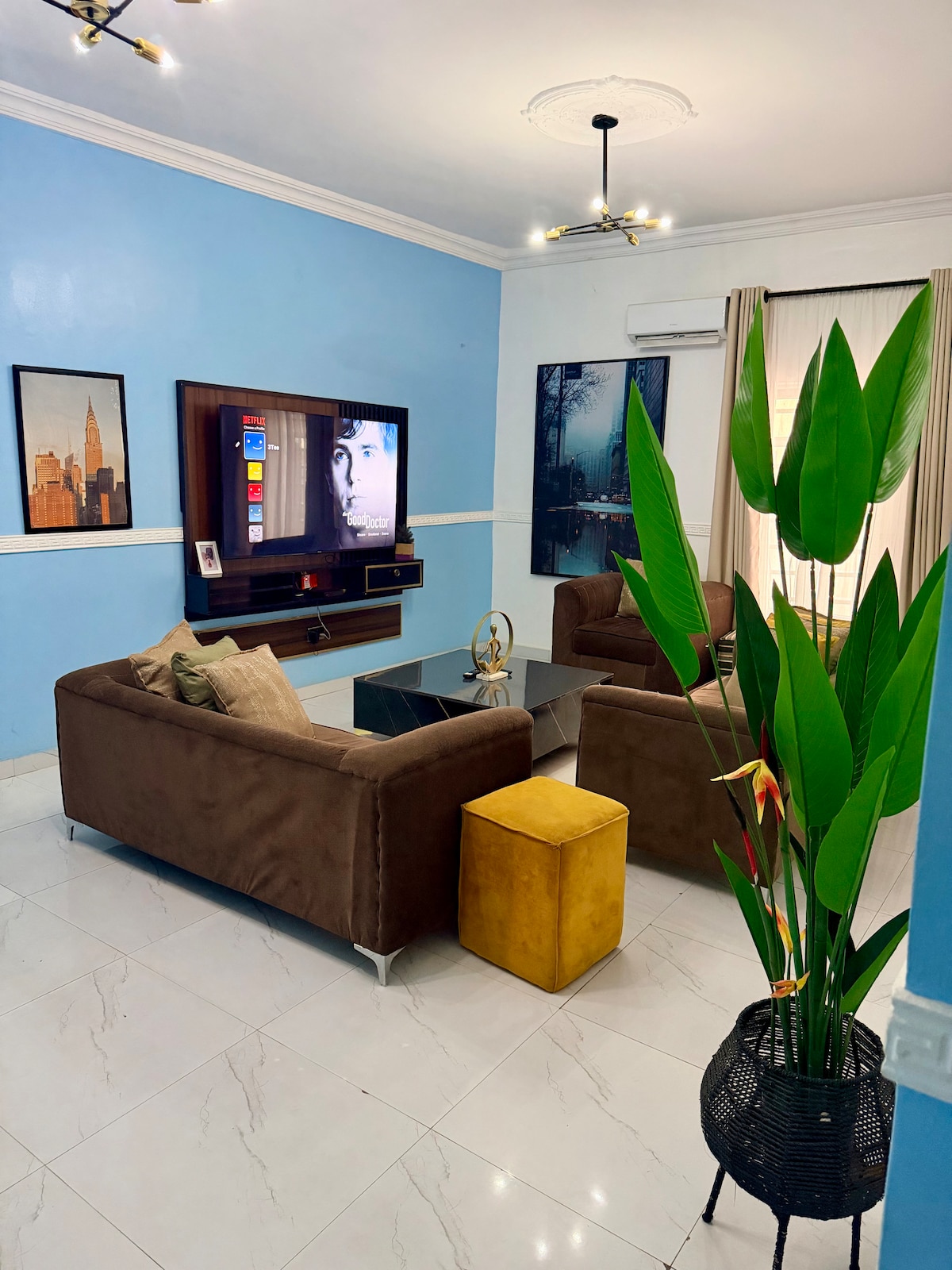 This beautiful apartment is located in a serene & secure environment & offers guests a home-away-from-home feeling.. Guests have access to fabulously-designed & decorated rooms/living room, a modern kitchen, Netflix/Prime streaming, unlimited internet, & 24/7 power supply (SEE HOUSE RULES ON ELECTRICITY ARRANGEMENT before booking). We deliver top-notch hospitality services to our guests, which makes us the perfect plug for your short & long term stays!