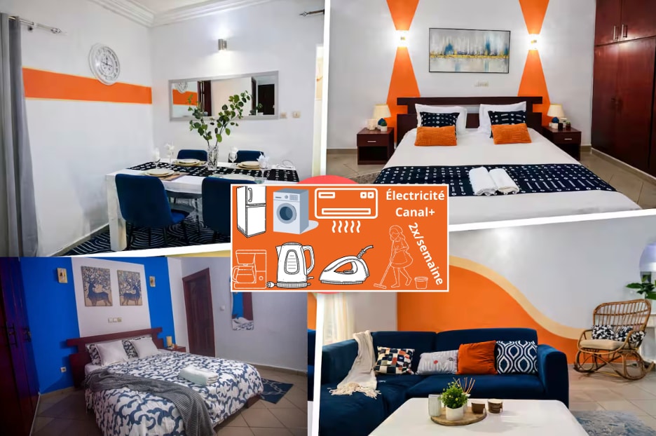 🏅Mezi nejlepšími 10 % nejoblíbenějších domovů na Airbnb. Užij si stylový apartmán se 3 ložnicemi v srdci zóny 4. Je světlý, elegantní a útulný, s vkusným dekorem, jemnými tóny, zlatými akcenty a místním uměním. Ideální pro relaxaci nebo práci na dálku, s ložním prádlem hotelové kvality, plně vybavenou kuchyní a každodenním úklidem. Nonstop ostraha zajišťuje klid během pobytu v jedné z nejživějších čtvrtí Abidžanu.