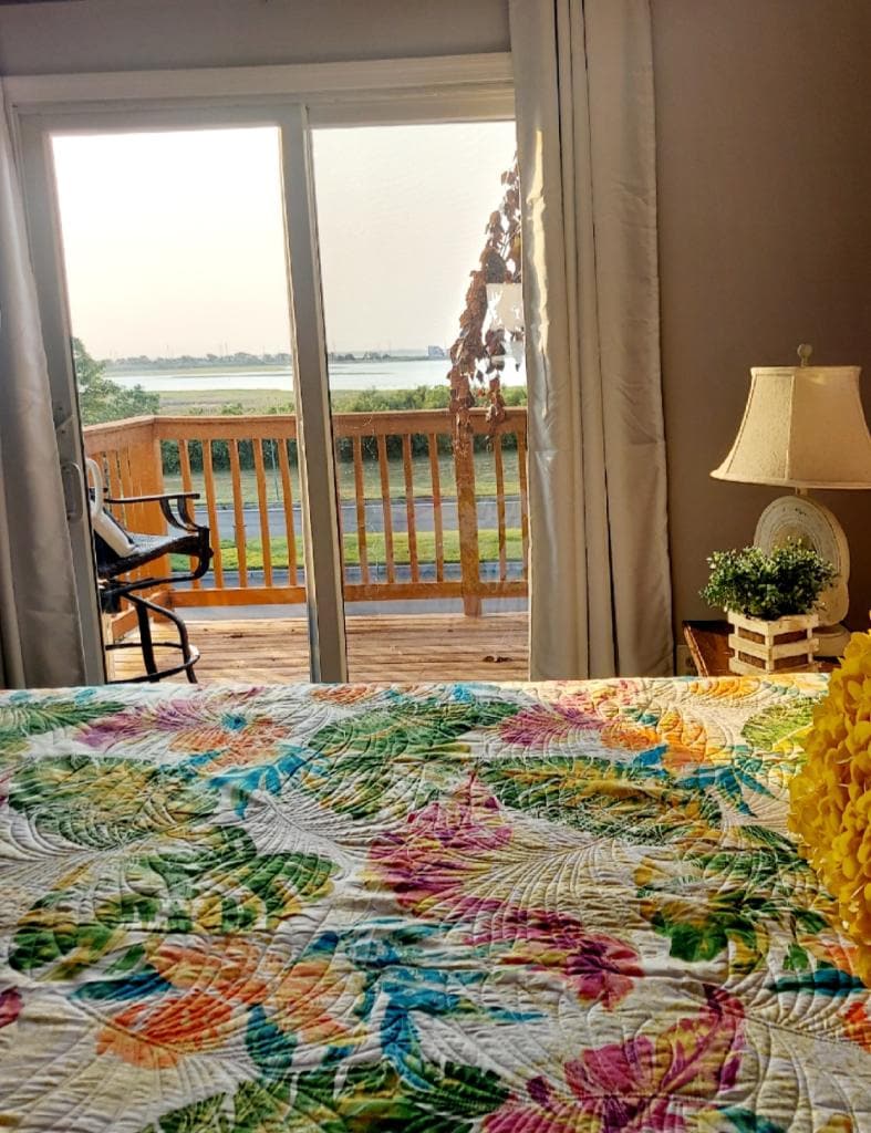 Výhled na západ slunce nad zálivem, MÍSTO K COUVÁNÍ LODÍ, 3pokojový řadový dům, 6 minut chůze na pláž. 2 paluby, 2 KAJAKY, paddleboard, 2 příjezdové cesty, WiFi, 50palcové televizory Samsung +, Netflix, Max, Hulu, Prime, Disney. 2 velké manželské postele, 1 dvoulůžko. 2 dětské ohrádky. Vstup bez klíče. Venkovní sprcha, gril, velký dvorek. Všechny nové postele, matrace a nábytek Raymour & Flanigan. Plážový vozík, 4 visačky, židle, slunečníky, hračky. Ložní prádlo / povlečení / osušky a plážové ručníky, kávovar Keurig. Ubytování pro 6 osob + 4 děti – 2 postele, 1 nafukovací matrace a dětská postýlka