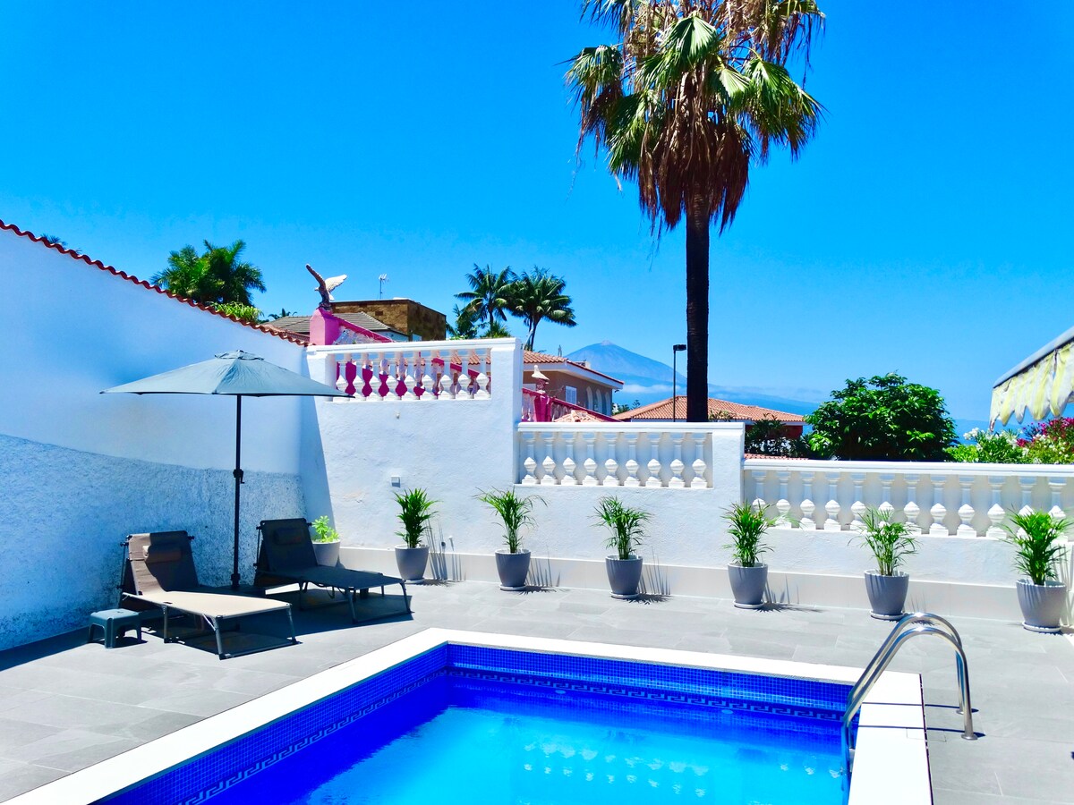 Unser FEEL GOOD Ferien Apartment bietet Ihnen einen grandiosen Meerblick durch eine raumhohe Fensterfront im Wohnbereich. Erleben Sie traumhafte Sonnenuntergänge und genießen Sie die weitläufige Sonnenterrasse und den gigantischen 30 Meter Pool inmitten eines gepflegten tropischen Gartens. Das Appartement liegt sehr zentral. Durch die nahe Autobahnanbindung erreichen Sie Puerto de la Cruz und La Orotava in 10 Minuten, den Flughafen Nord in 15 - 20 Minuten. Playa El Ancon: 2,1 km Teide: 34 km