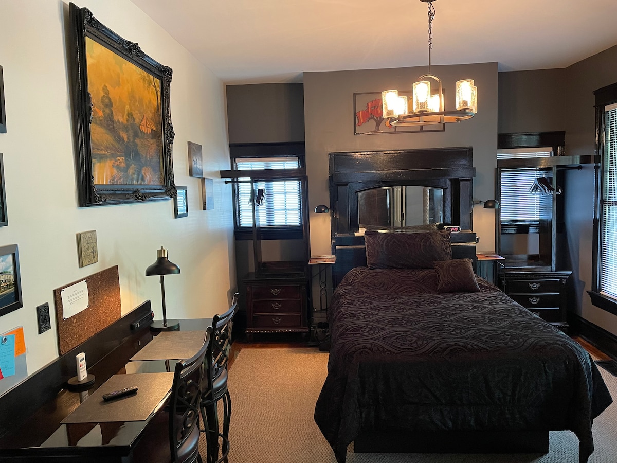 Experience Historic Living w/ Modern Day Amenities. Located in Five Points South, one block from UAB. An interior design of bold, dark, solid colors. Perfect for one or two people. Work, Play, or just hang out in Birmingham. Completely furnished for everyday living. Queen bed.We have remodeled 1895 structure (year built) & added modern day amenities. The air conditioning system, with a window flow unit, duplicates the way air was distributed to different areas of a house by way of a room blind.