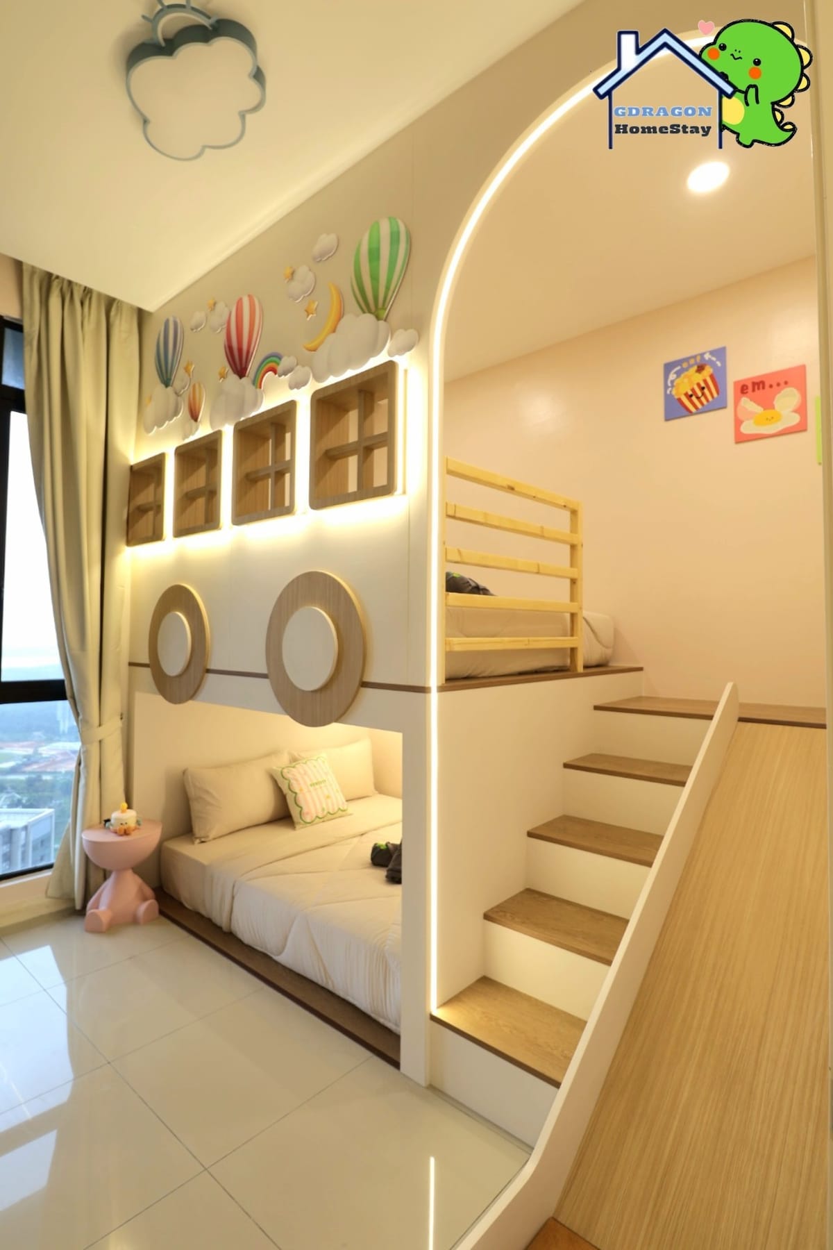 Moderní design a pohodlí Ultimate Kids-Friendly Haven Airbnb Experience - Ložnice: Loftová ložnice se skluzavkami – Matrace velikosti Queen × 2 V docházkové vzdálenosti od Legolandu a Gleneagles Hospital nabízíme snadný odpočinek pro dospělé, zatímco děti si vymýšlejí své vzácné vzpomínky . – Postel vhodná pro děti a kojence se skluzavkami, kuchyňské hračky – Balkon Soukromý výhled