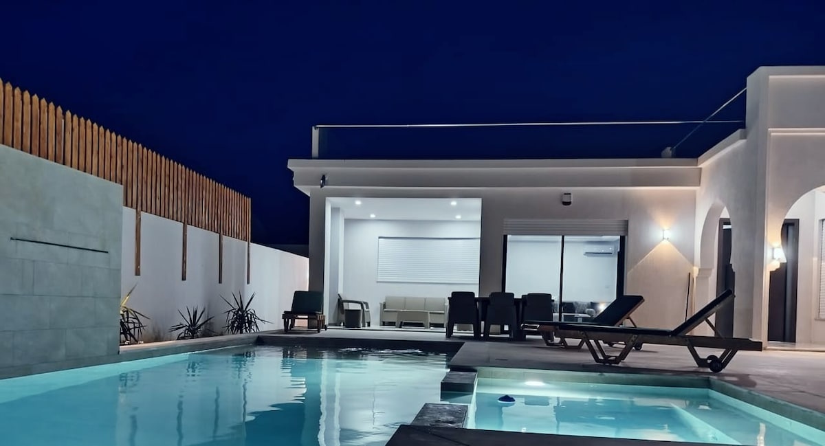 Naše krásná vila s bazénem se nachází 60 metrů od pláže. Ideální pro rodinu nebo tři kamarádské páry, vila má tři dvoulůžkové pokoje, velký obývací pokoj s krbem, velkou terasu se zahradou a venkovním grilem, dvě koupelny, 3 WC a kuchyň. V blízkosti obchodů a hotelových zařízení (soukromé pláže, bazény, bary, restaurace, lázně a masáže) a za kasinem. Vítejte v Djerba!