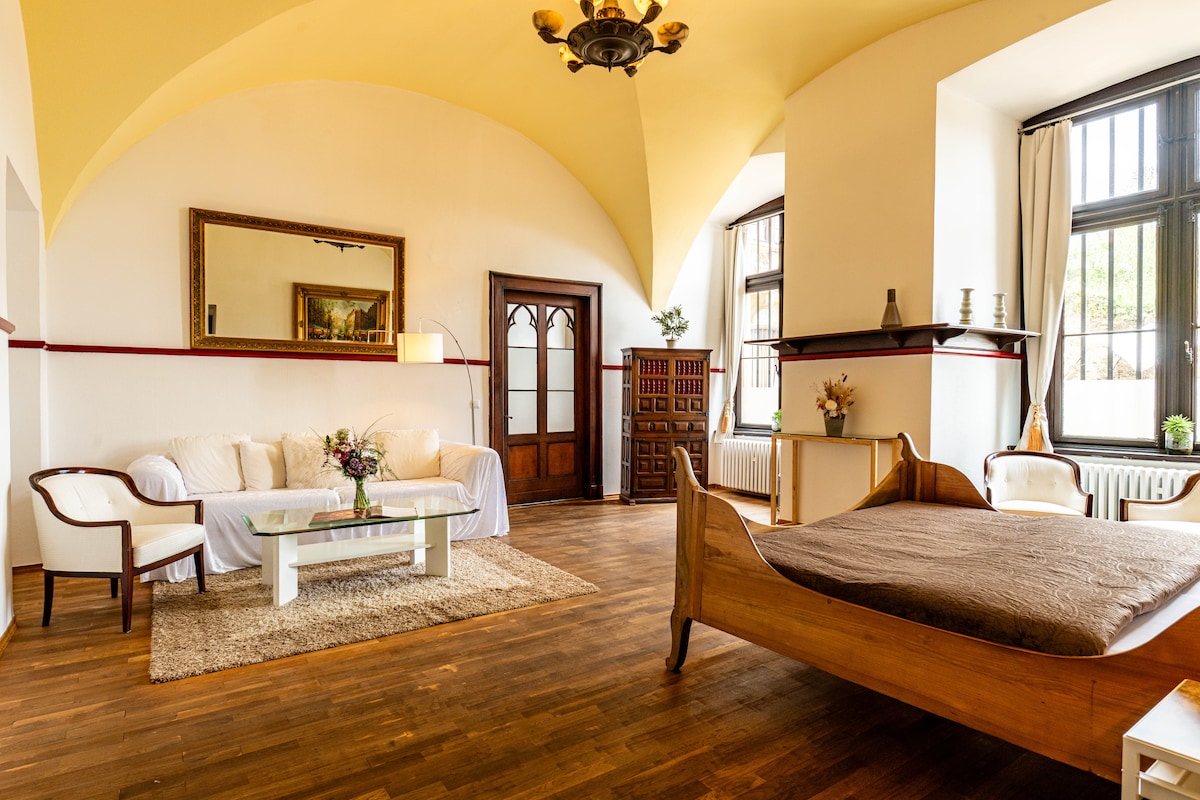 Stylový mezonet se nachází v levém křídle historického panského sídla. 3 luxusně zařízené ložnice s vlastní koupelnou a manželskými postelemi mají přístup na terasy o rozloze 200 m ². There is a noble fireplace room/dining area,a fully equipped kitchen with breakfast corner, a separate entrance,wardrobe and a children's playroom that is lovingly equipped with books) Uprostřed přírody mají možnost užít si čas s rodinou a přáteli
