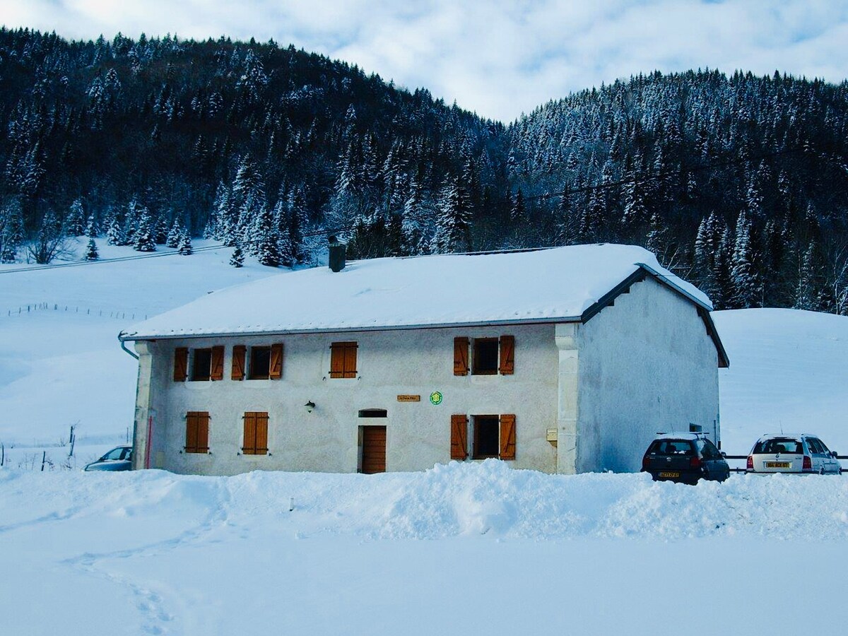 La Belle Vache (BV), velmi pěkný loft, dům o rozloze 90 m2, zcela samostatný, sousedící s domem majitelů, v krásném přírodním prostředí v nadmořské výšce 1100 m. 180° výhled na pohoří Jura, v srdci středně vysokých hor s bohatou kulturní a historickou identitou, Haut-Jura. Nachází se na trase velmi pěkných turistických tras, 10 minut od nejlepších míst pro běžkování ve Francii. 1 hodinu od Ženevy, 10 minut od pláže u jezera Lamoura.