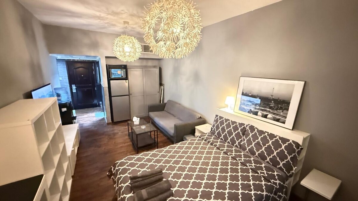 Luxusně zařízené studio s moderním designem, útulnou postelí, stylovým posezením, plně vybavenou kuchyní a elegantní koupelnou s hotelovým vybavením. Vysokorychlostní wifi a skvělá poloha v blízkosti restaurací a atrakcí, ideální pro krátkodobé nebo dlouhodobé pobyty.
