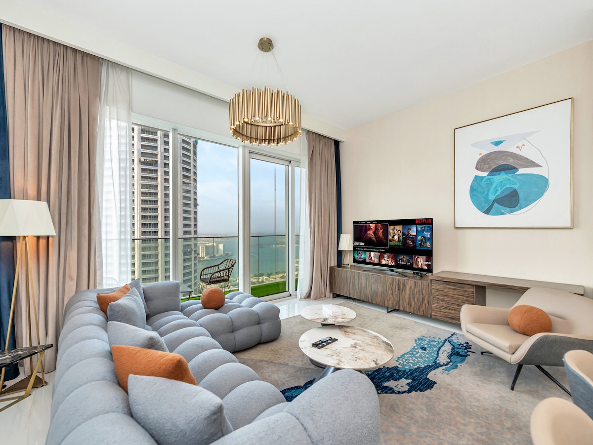 Vítej v LUX | Apartmá Palace Beach. Objev luxusní bydlení v Emaar Beachfront v Dubaji. Tento elegantní apartmán se může pochlubit úchvatným výhledem, prosluněným obývacím pokojem, moderní kuchyní a klidnými ložnicemi s okny od podlahy ke stropu. Užij si prvotřídní vybavení, včetně nekonečného bazénu, soukromé pláže a fitness centra. Perfektně umístěný, nabízí snadný přístup k nejlepším dubajským restauracím, nákupům a zábavě.