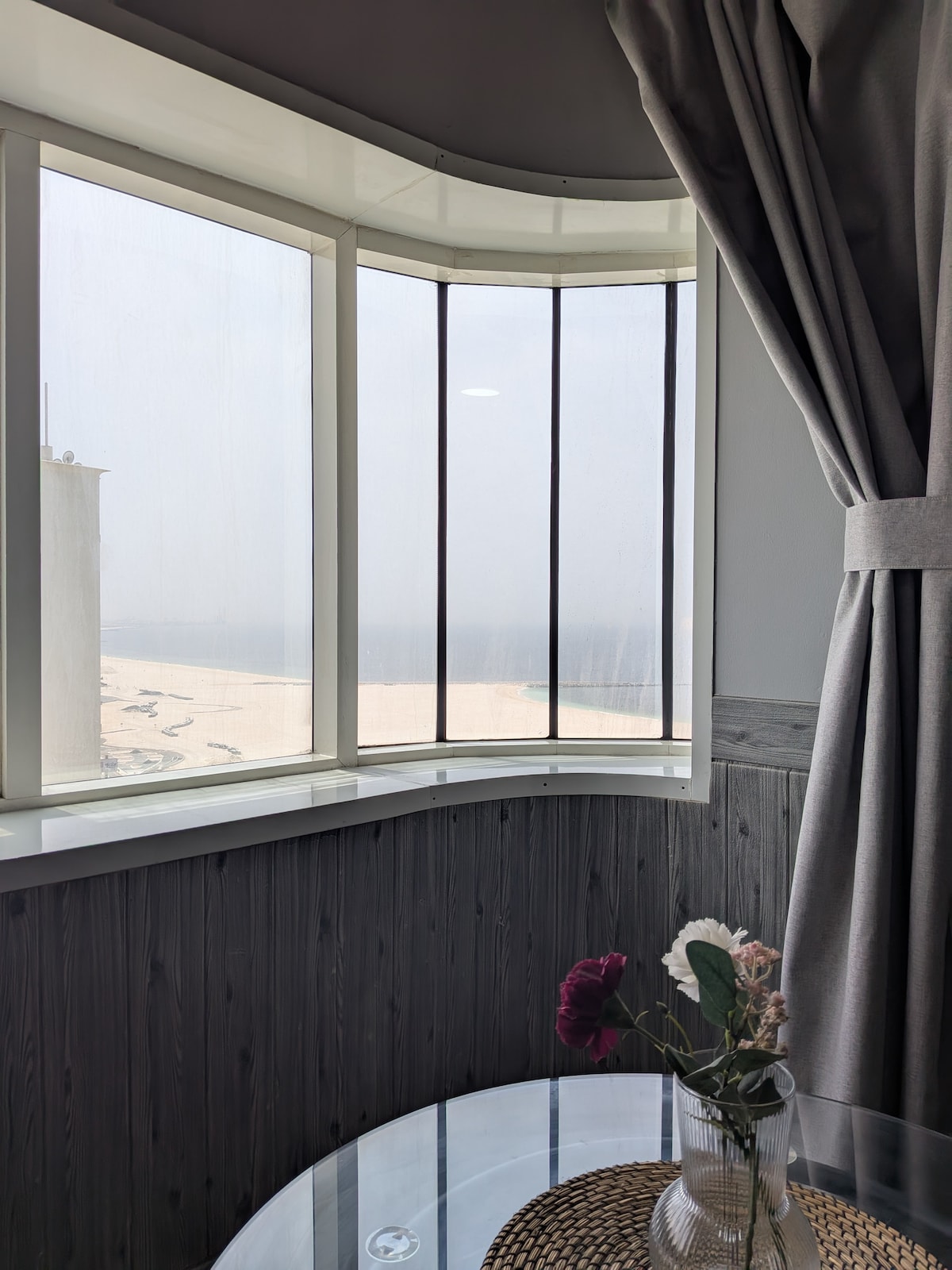 Spacious 1-bedroom apartment with stunning sea and city views. The large bedroom features panoramic windows, filling the space with natural light. Enjoy a cozy living room, a private balcony overlooking the water, and a relaxing seating area by the window. Perfect for couples, solo travelers, or business guests, with easy access to shops, cafes, and transportation.