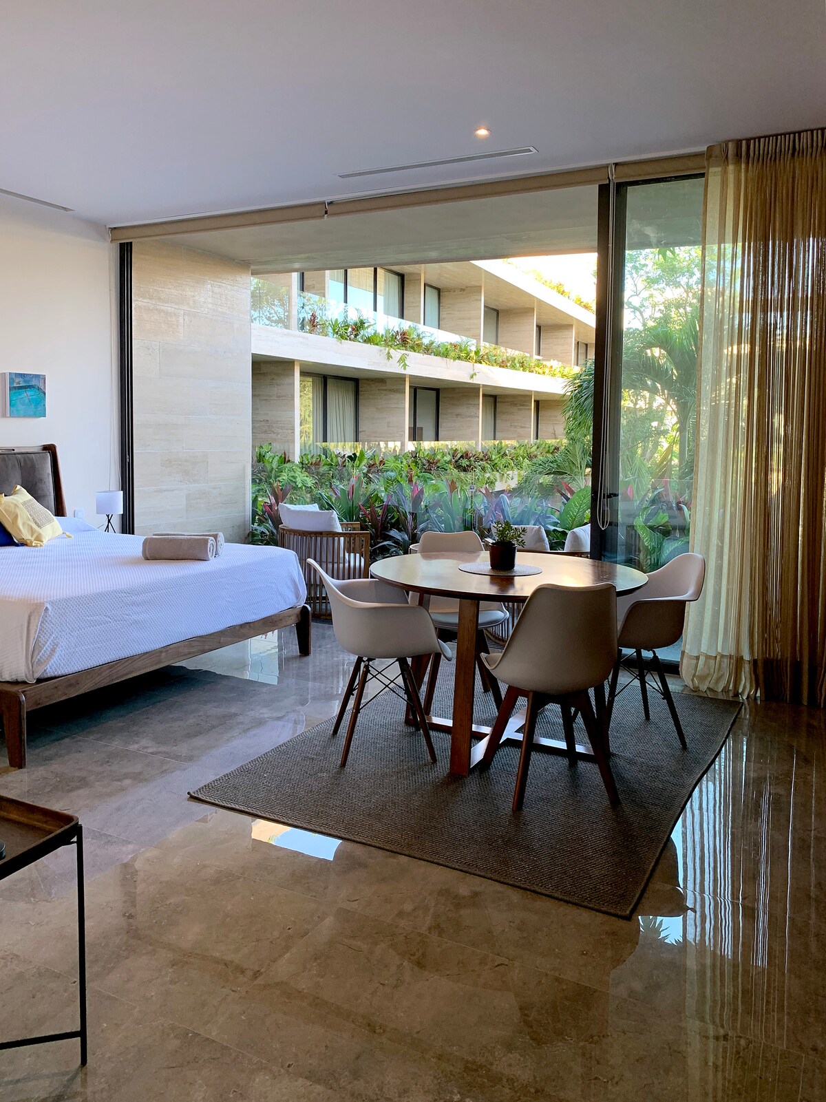 STUDIO E203 is an exceptional, spacious studio with all comforts and views of the beautiful interior for unforgettable vacations in the luxurious MISTIQ. It is located between Tulum and a shuttle to the beautiful beach. The studio is designed for couples and can be extended with Studio E202 (connecting door). MISTIQ with large pools, Jacuzzi, gym, spa, French bakery, super market and private beach. With elevator to the studio. 100mbps Internet (optical fibre).