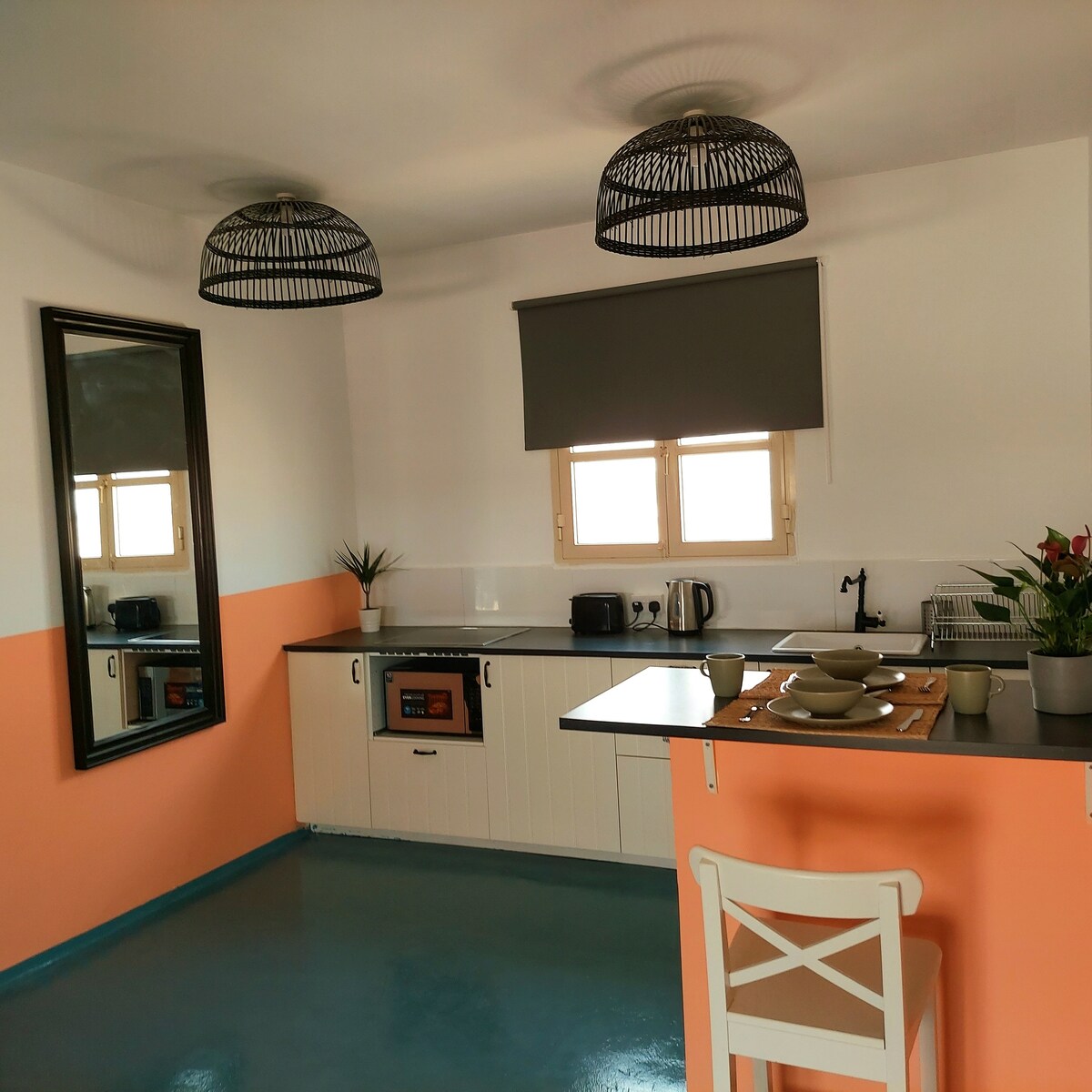 Jednopokojový apartmán se skládá z hlavní ložnice s obývacím pokojem, který pojme maximálně 3–4 osoby, a kuchyně/spíže vybavené kuchyňskými potřebami, prádelny, žehlení, skříně, 65palcové televize, internetu, 2 parkovacích místa, soukromého vchodu v blízkosti centra města. Minimální rezervace na 2 noci je nutná k pokrytí provozních nákladů.