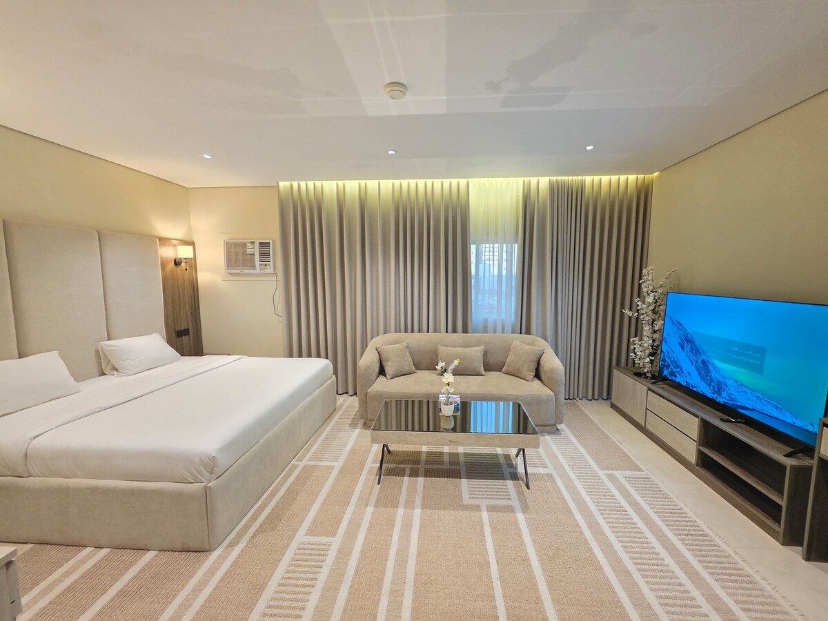 Doporučené plně vybavené studio Lokalita: Belt Zone V blízkosti všech služeb a akcí – Vlak Haramain: 7 minut – Prorokova mešita: 8 minut - Letiště: 15 minut – Mešita Quba: 10 minut Skládá se z : Ložnice + koupelna Služby – Chytré přihlášení - Lednice – 60palcová televize - Denní úklidová služba Netflix + Sledovat + Youtube - Parkování v interiéru Prostory : Toto moderní studio se vyznačuje vysoce kvalitními designovými prvky, hosté si mohou odpočinout v luxusním salóne a užít si 60palcovou televizi, najdete zde plně vybavenou koupelnu.