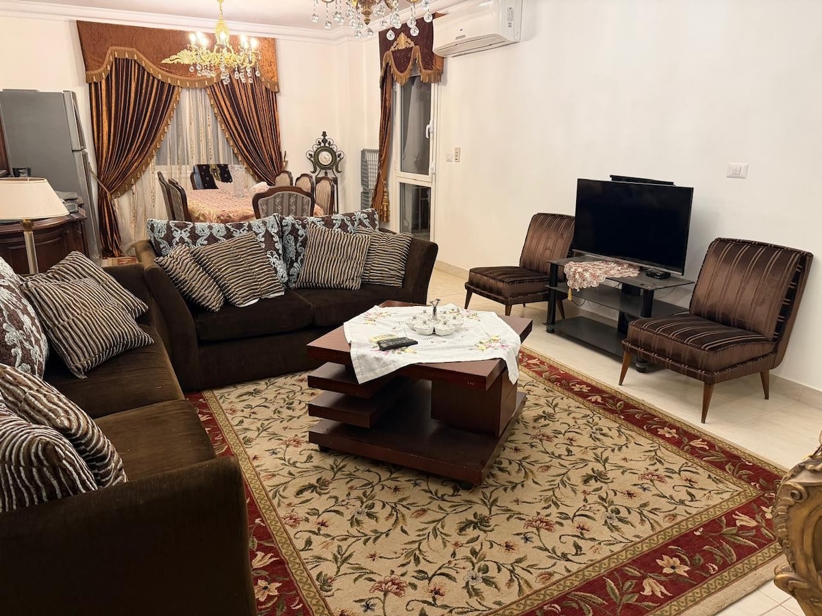 Welcome to your home, suitable for short and long stays. Our spacious 2-bedroom apartment is just 5 minutes from Cairo Airport. The master bedroom features a king-size bed and a baby crib for your little ones (age 0-8y). The second bedroom has two medium beds. 50-inch TV (Netflix included)fully equipped kitchen has everything you need, from a gas stove to a microwave and kettle. Relax on the balcony with a lovely tree view, or stroll just a minute to local supermarkets, bakeries, and many more.