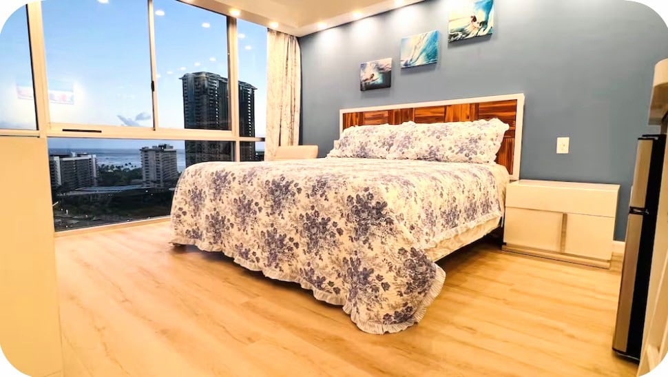 NOVINKA! Waikiki City View Studio. This newly renovated studio offers 382 sq. ft. of stylish living space with a spacious lanai, where you can enjoy breathtaking city&Koolau mountain views and enjoy your meal. Uspořádání ložnice: • Velká manželská postel pro maximální pohodlí • Dvě dvoulůžkové futony v japonském stylu Vybavení kuchyňského koutu: • Rychlovarná konvice s bezplatnou mletou kávou a ibiškovým čajem • Přenosná indukční varná deska pro lehké vaření • Jídelní talíře, misky, mikrovlnná trouba a vinný sklep