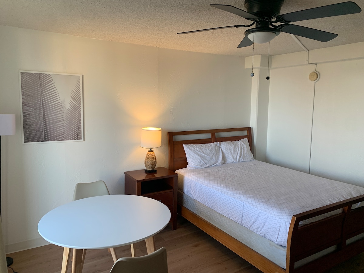Malý a útulný byt o rozloze 236 čtverečních stop. Nachází se na začátku Waikiki, asi 10 minut chůze od pláže a srdce Waikiki. Přes most je kongresové centrum a 15 minut chůze od nákupního centra Ala Moana. Studio je plně zařízené - velká manželská postel,TV, Wifi, středně velká lednice, plně vybavená vana, mikrovlnná trouba, kávovar, indukční varná deska. V budově je prádelna, bazén, vířivka a gril; za příplatek můžeš využívat posilovnu a parkování.