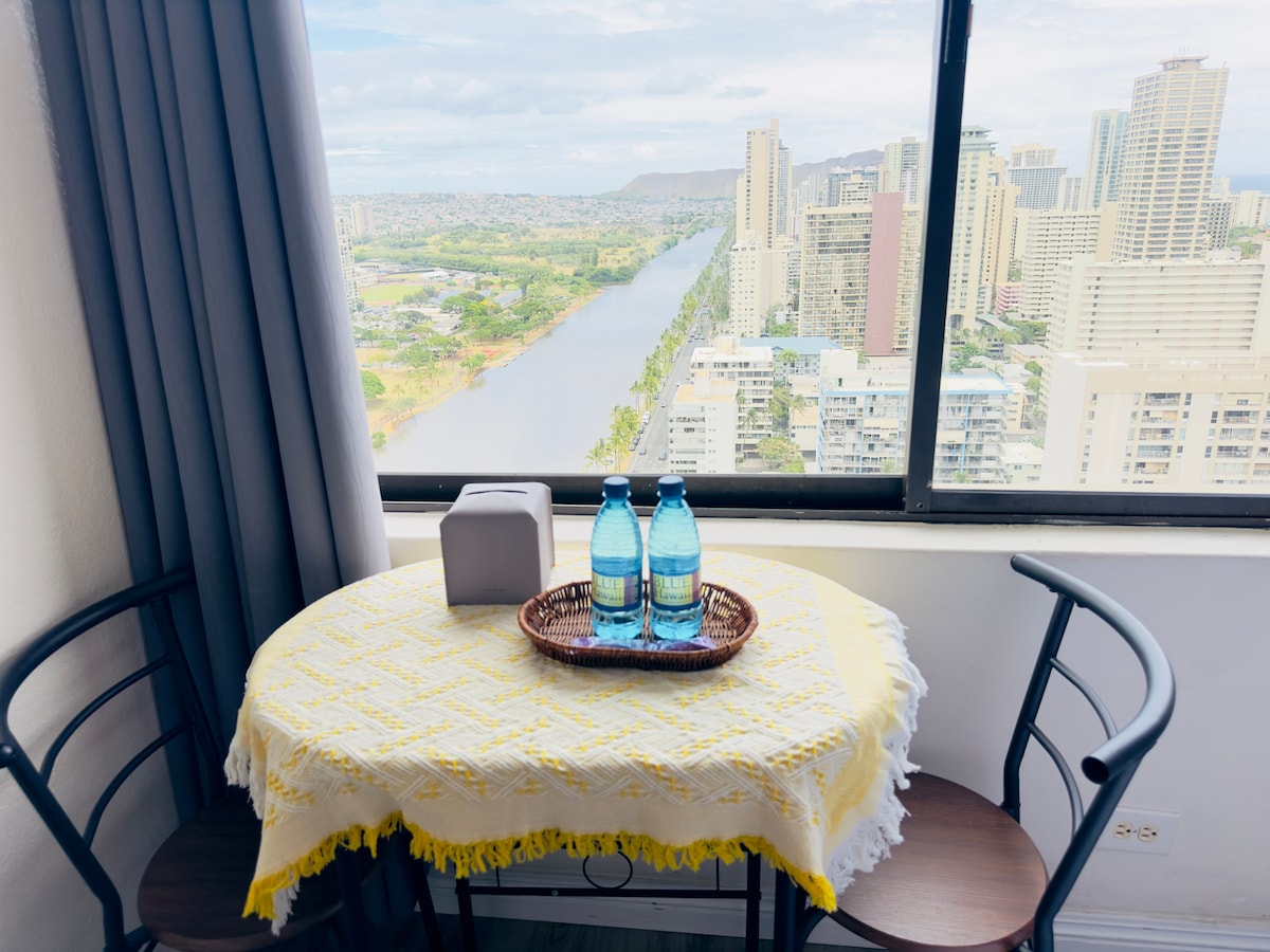 *Aloha! Welcome to the cutest studio in Waikiki!* This is a fully remodeled cute studio with kitchenette in the Hawaiian Monarch. Where everything is walking distance away. Featuring the best Boho style interior design, diamond head and river view, south facing big window, standing desk with monitor and keyboard, 100Mbps wifi speed and projector for 80 inch screen size! NEVER TOO SMALL to have the best stay in Honolulu Update on May 2025, *CHEAP PARKING! And new AC! Parking is $20/day