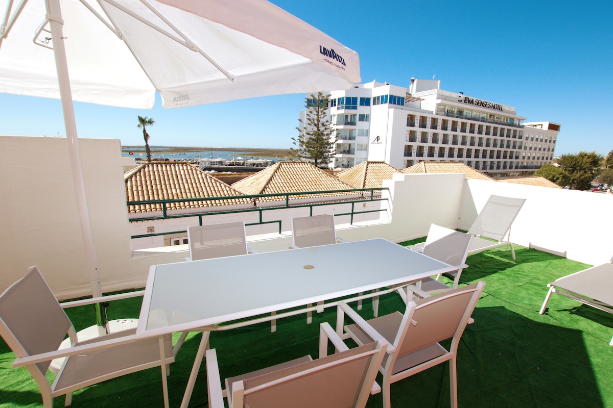 Nachází se v apartmánovém komplexu s nádherným výhledem na oceán a ústí řeky, na okraji staré rybářské vesnice Olhão a přístavu. Tento luxusní apartmán má 3 ložnice a 3 koupelny a nachází se na ideálním místě pro relaxační dovolenou a pro objevování ostrovů, Algarve a dalších míst. Obrovské posuvné dveře se otevírají na velký soukromý balkon s venkovním stolem a židlemi pro nádherný kulinářský zážitek a místo k posezení a užívání si teplého podnebí Algarve.