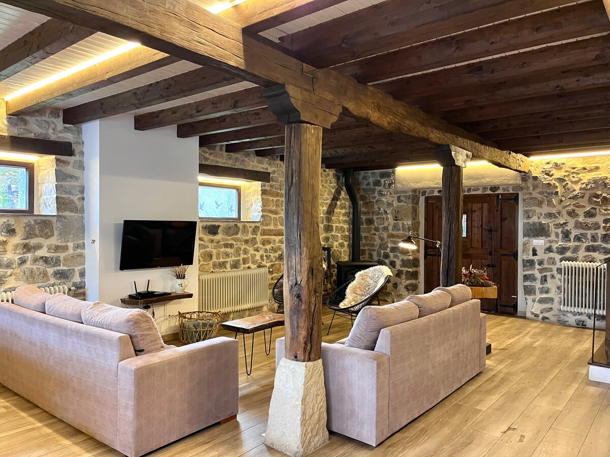 Venkovská chalupa z kamenné a břidlicové střechy, původní z oblasti s jedinečnou polohou a výhledem, má soukromý dubový a kaštanový les s vlastním piknikovým stolem a rozsáhlou farmou pro procházky v neporovnatelném prostředí, 2 patra, 3 pokoje, jeden z nich s pohovkou a televizí, gril - venkovní krb, vodní studna, krytá veranda, terasa - balkon, vyhlídka - kamenná terasa zavěšená na svahu s nádherným výhledem na údolí a hory, stejně jako celý dům.