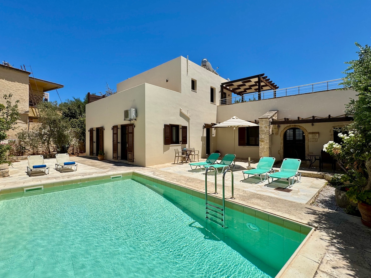 Aquila Villa is built on the top of a hill offering unobstructed 360° panoramic view. The unspoiled village of Drapanos is 600m away, while the organized, sandy and shallow beach of Almyrida is 5.5km away. There are 2 taverns and a mini market in the village; for more choices you must drive to Plaka, 4.5km away. The villa has a big open plan area, 4 bedrooms, 4 bathrooms and a wc. There are 3 pergolas, a bbq and a huge, infinity, heated pool with a children's area.