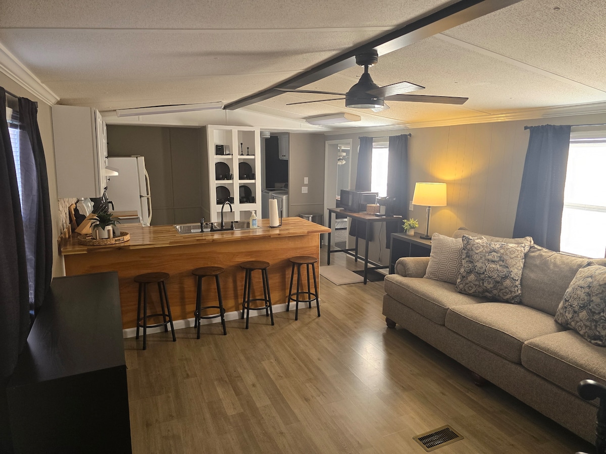 Tato klidná chalupa je ideální pro relaxaci. Nejsou zde žádná schodiště. Jednotka nabízí manželskou postel, vysokorychlostní internet, 48" televizi, pračku a sušičku, plně zásobenou kuchyň a zbrusu nové spotřebiče. Otevřený obývací a jídelní kout nabízí pohyblivý bar s pohovkou a další židlí se stoličkou. V okolí jsou restaurace, obchody a potraviny. Jednotka má vyhrazené parkovací místo se soukromým vchodem. Pokud máš s sebou chlupatého mazlíčka, je k dispozici oplocený prostor.
