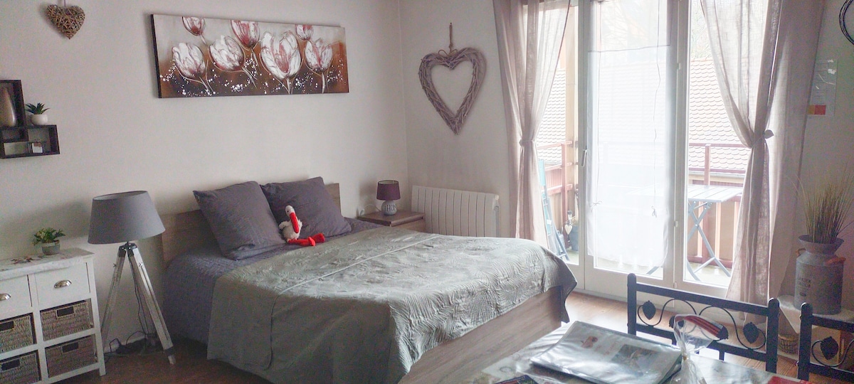 Vítáme vás v příjemném a útulném studiu o rozloze 25 m2 s vanou a garáží 2,5 x 5 m (garáž se nezavírá) v bezprostřední blízkosti turistických stezek, v blízkosti Colmaru a vinařské stezky. Wifi v ADSL 3-Epis, pekárna, půjčovna kol a 2 restaurace. Více informací v nula šest třicet jedna sedmdesát jedna osmdesát pět nula tři Respektujte prosím klid lidí žijících v budově (žádné večírky, hluk na chodbách...).