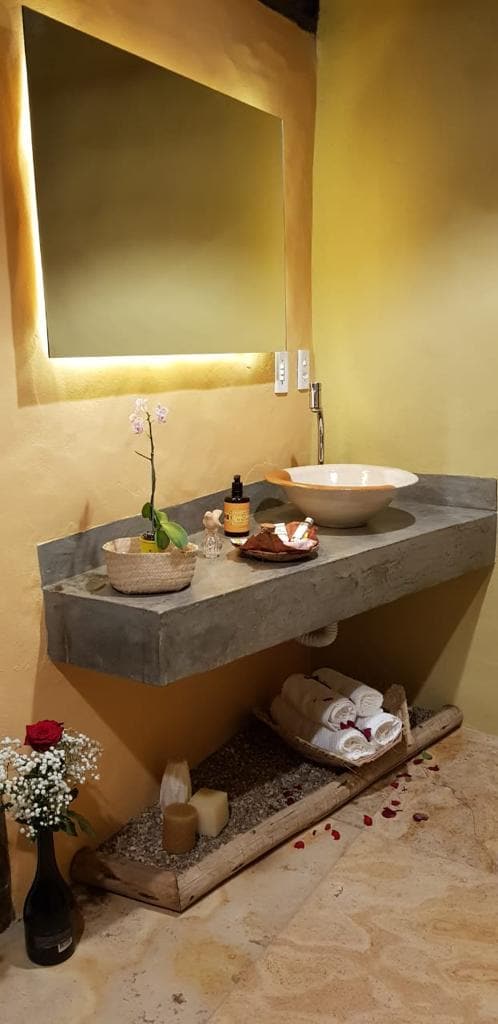 Bungalow de 40 metros quadrados com ar condicionado, frigobar, Smart TV, cafeteira, uma cama super kingsize e duas de solteiro, lençóis de 400 fios, três tipos de travesseiros, Wi-Fi. Banheiro completo, água fria - água quente, aquecimento solar, jacuzzi privativa e chuveiro externo ao ar livre. Café da manhã personalizado com sucos naturais e detox, frutas, tapiocas mel e granola preparados com artigos naturais. É fornecido somente café da manhã.