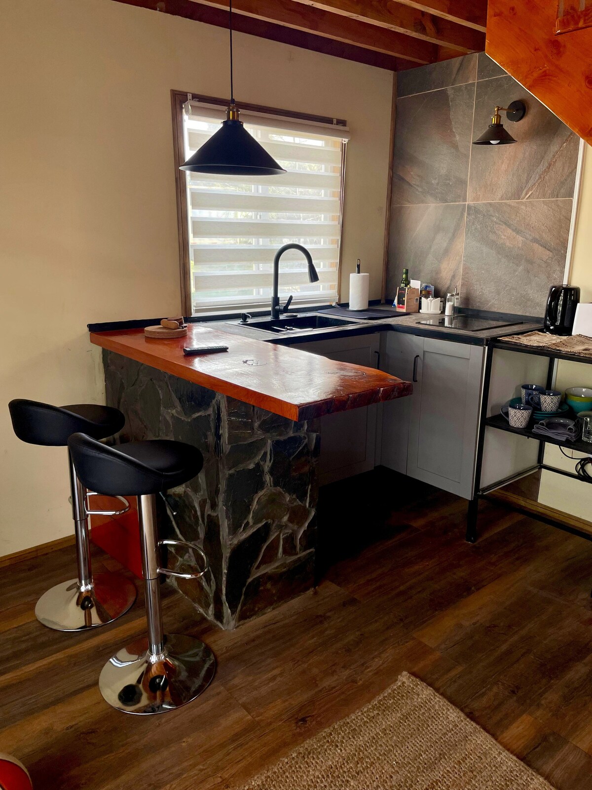 Disfruta de la sencillez de este alojamiento. Amplia cabaña ubicada en un barrio tranquilo, en patio trasero de casa habitacional, cercana a supermercados, parques, hospitales y restaurantes, con excelente acceso a locomoción. Cuenta con entrada independiente y tiene disponible un estacionamiento cerrado. Cuenta además, con una maravillosa y amplia terraza rodeada de naturaleza. La cabaña cuenta con calefacción central, además de calentador eléctrico, cama matrimonial y un sillón cama.