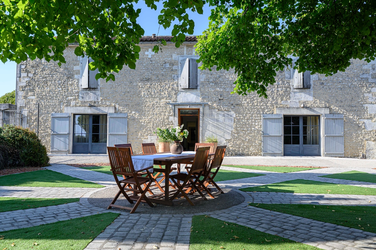 1854Chassors- Charente gîte is in the courtyard of a former Cognac distillery. Along with 1 other gîte, there are fantastic facilities: heated swimming pool, spa/relaxation area, fitness/games room, covered barbecue area, pétanque lawn and large gardens front and back. All perfectly hidden behind high walls in a village only 5 mins by car from Jarnac. 95m2 in size, with 2 bedrooms & 2 bathrooms, it is newly renovated to a very high standard with everything you might need and more.Hi-speed wi-fi.