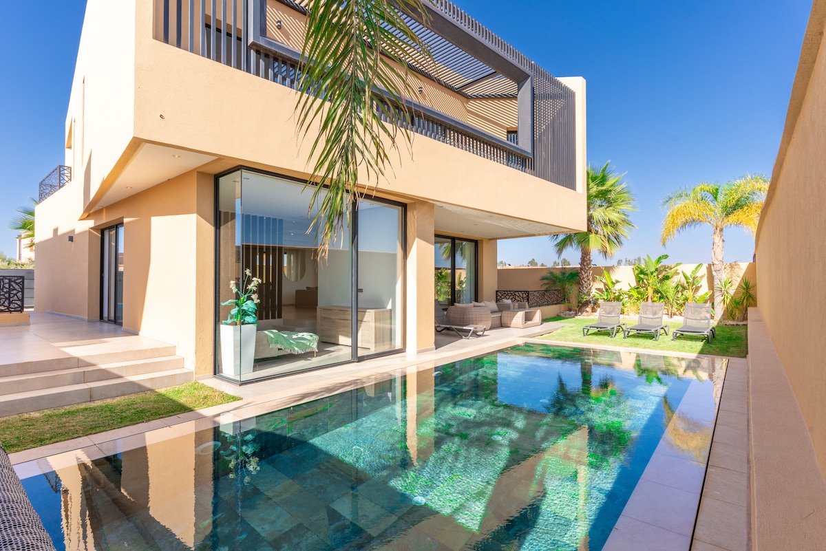 Tato nádherná architektonická vila, postavená na pozemku o rozloze 1020 m² s 360 m² obytné plochy, se nachází v těsné blízkosti golfových hřišť. Má 5 ložnic a pojme až 8 lidí. Velmi světlý, nabízí krásné prostory, včetně velkého obývacího pokoje s krbem, a optickým kabelem. Hosté si užijí krásnou bujnou zahradu a bazén XXL, obklopený několika lehátky pro chvíle absolutního odpočinku. Kuchyně je plně zásobená