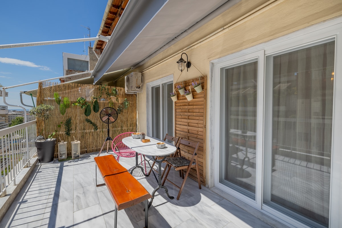 Centrální loft, světlý, s velkým balkonem a nádherným výhledem. Nachází se v centru, na obchodní ulici, vedle městské pláže. Prostor Pohodlný zrekonstruovaný loft v 9. patře, s výtahem, velkým balkonem s nádherným panoramatickým výhledem na Thermaikos. Moderní a světlý, s Wi-Fi, smart TV a klimatizací, se nachází ve velmi centrální a komerční čtvrti, v centru města s přímým přístupem na pláž, k veřejné dopravě a hlavním památkám města.