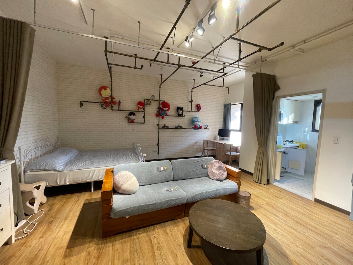 結合臥室、客廳的開放式空間。 特色水管牆營造工業浪漫氛圍, 白天是設計展間,夜晚是溫馨臥房。 可彈性加床為四人房,附廚房與衛浴, 暖光、木地板讓旅程更放鬆。