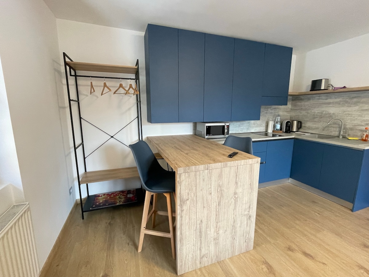 Nádherný studio apartmán, kompletně zrekonstruovaný v severském stylu, velmi světlé, jedinečný prostor s 140 x 200 cm postelí, kuchyň s ostrovem, koupelna s WC, bidet a sprchový kout. K dispozici je HD televize, wifi a detektor kouře. Nachází se v klidné oblasti, jen minutu chůze od lyžařských středisek Magnolta a městského bazénu a 1 km od centra Apricy. Bezplatné parkování před vchodem.