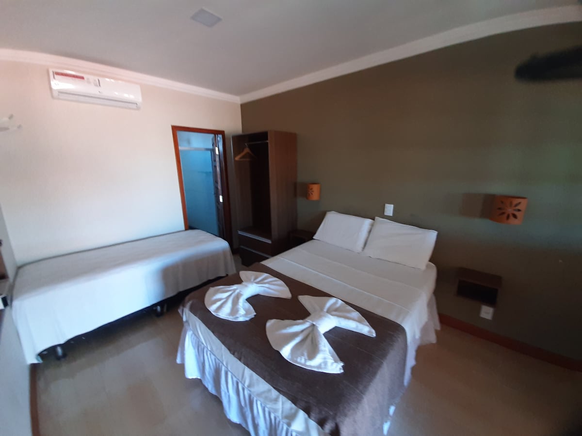 O quarto é amplo e aconchegante, com 1 cama de casal e 3 de solteiro, guarda-roupa, frigobar, água quente, e 2 ventiladores.