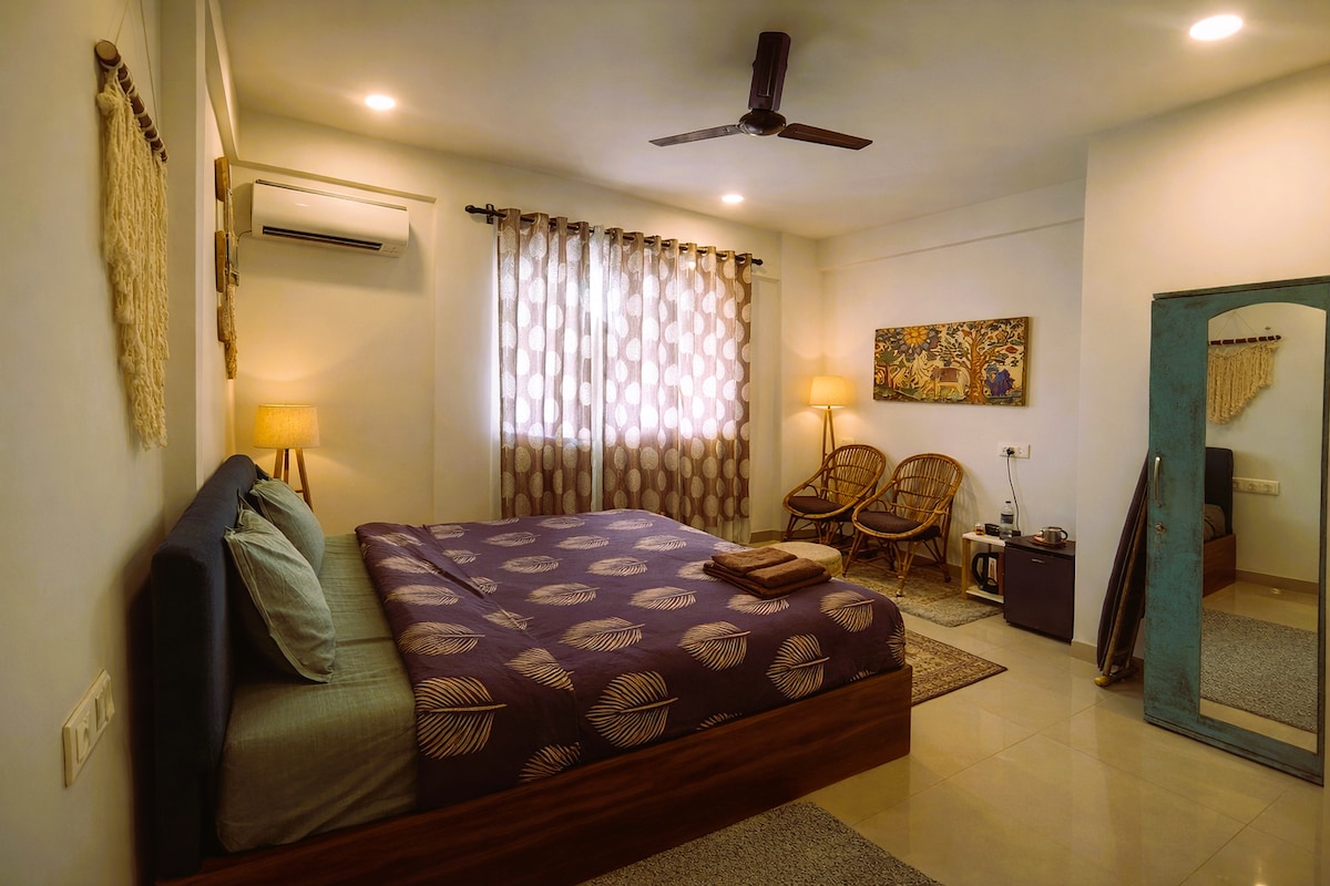 Spacious, Classy Retreat near Morjim Beach! Discover our warm and fully-furnished, ultra-spacious 120 Sq Meter room located right in the vibrant heart of Morjim. The large bedroom offers plenty of room to spread out and chill, complemented by a dedicated private attached bathroom. The best part? The famous Morjim Beach is easily walkable from your door, offering you fantastic, direct views and effortless access to the sand and surf. Book your spacious, perfectly-located escape today!