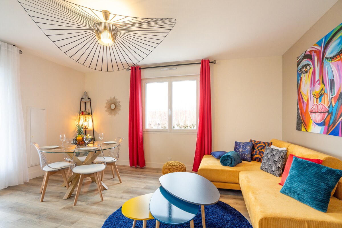 Détendez-vous dans ce logement de "standing"(60m²) calme, confortable, élégant et climatisé pouvant accueillir 4 personnes. Cet appartement propose des équipements haute gamme, 2 chambres, literie de 160 et TV connectées. Doté d'une décoration soignée. Terrasse ensoleillée (20m²). " Parking Privé " Situé dans un quartier résidentiel à 10 min du centre ville de La Rochelle, de l'aéroport, de l'île de Ré et à 150m d'un carrefour-city, boulangerie, transport en commun, cabinet médical et pharmacie.