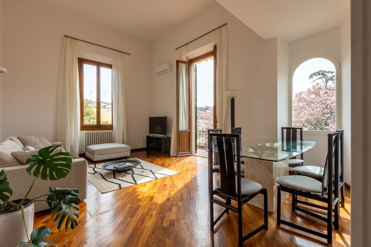 Vítejte v našem elegantním bytě se 2 ložnicemi, kde se moderní design setkává s pohodlím v jedné z nejexkluzivnějších rezidenčních čtvrtí u vchodu do historického centra Florencie. Tento klenot se nachází ve 2. patře (bez výtahu) budovy z roku 1926 a nabízí jedinečnou směs sofistikovanosti, intimity a neuvěřitelného světla, díky čemuž je ideálním útočištěm pro váš pobyt. Je to klidný a elegantní dům s balkonem, který nabízí výhled na rafinovanou italské zahrady.