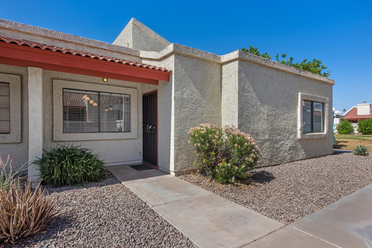 Tento řadový dům se nachází v Tempe. Jednotka je otevřená a slunná. Vhodné pro psy, blízko tréninkového kempu, Cubs, A's, Giants, Angels a další. Pár minut od centra Tempe, ASU, velkého outletového centra s kiny a restauracemi, společných bazénů (3) a vířivek, jednoho vyhřívaného bazénu v zimě, procházky do parku Kiwanis. Zbrusu nový (2025) úžasný psí park, který je v pěší vzdálenosti v Kiwanis Parku. Kuchyň je dobře zásobena pro vaření.