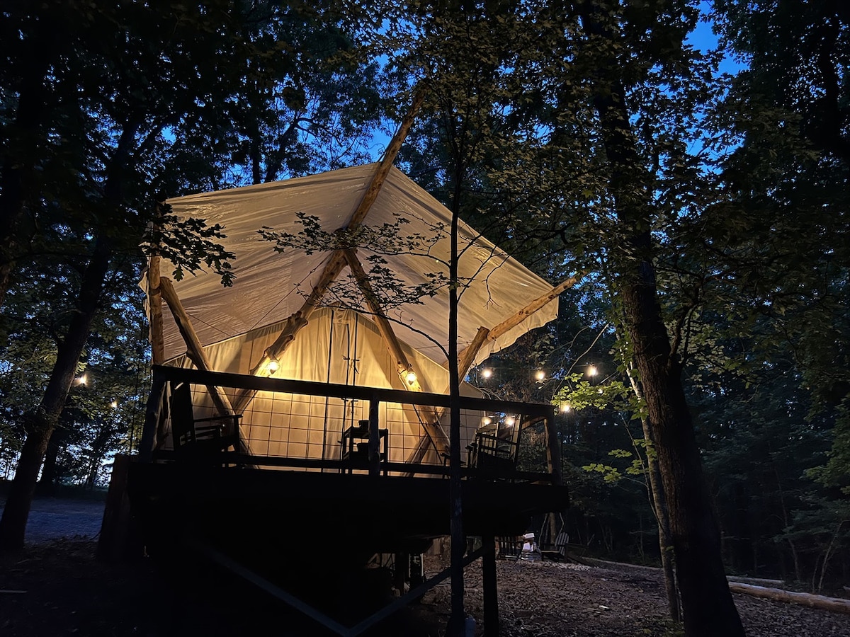 Tento luxusní glampingový stan, který se nachází v klidné a krásné oblasti Ozark Mountains poblíž řeky Buffalo National River, nabízí dokonalou kombinaci rustikálního šarmu a moderního pohodlí. Uvnitř najdete měkkou manželskou postel s jemným povlečením, ambientní osvětlení a okouzlující výzdobu, která vás přenese do přírody. Tento glampingový zámek nabízí snadný přístup k turistickým stezkám, kajakům a pozorování divoké zvěře a umožňuje klidný pobyt v přírodě – aniž byste museli obětovat pohodlí.