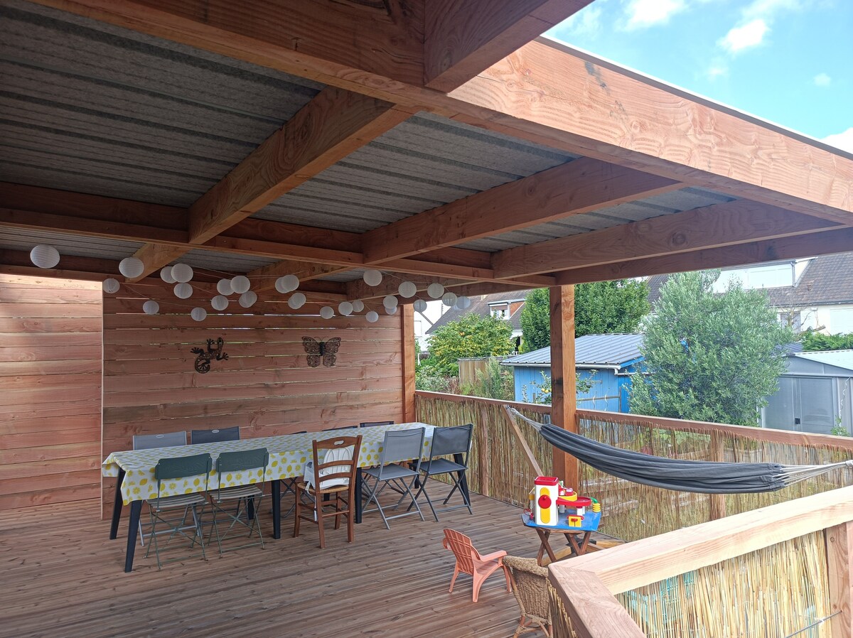 - Just 10 minutes from the racetrack and 5 minutes from the tram, enjoy this architect-designed house in a peaceful setting on the doorstep of Le Mans. - 3000m² garden, double garage and 2 private parking spaces. - Covered 5x10m swimming pool, petanque area. - 60m² terrace with bbq. The entire house is at your disposal, except for our bedroom and the study. You have access to all the traditional comforts: Wifi, TV, swimming pool, etc... A bathroom on the first floor with the 3 bedrooms.