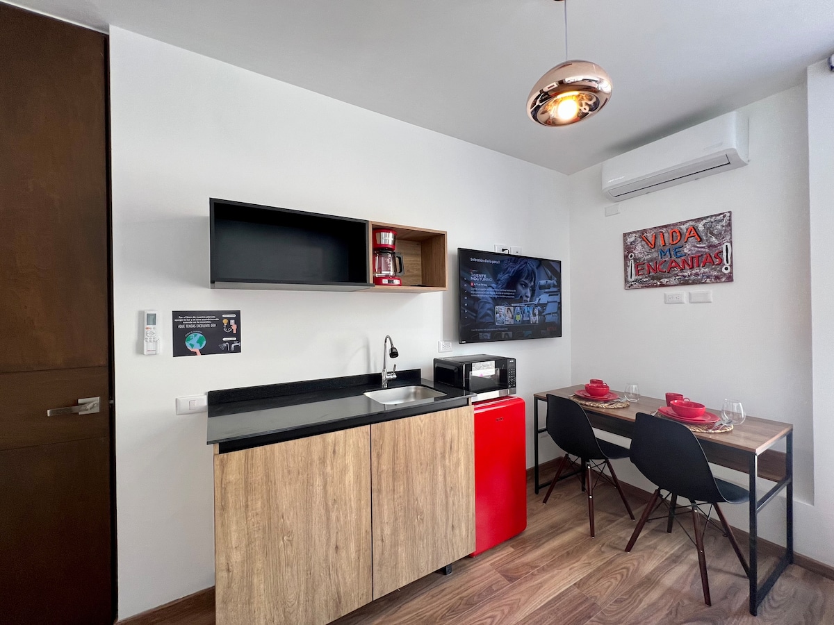 Toto jedinečné místo má svůj vlastní styl. Okouzlující zcela nový loft v moderním stylu v srdci tradiční čtvrti San Miguelito. Tento jedinečný a útulný prostor se nachází na střeše rodinného domu z 18. století, několik bloků od historického centra města. Přístup je po točitém schodišti s 20 schody, takže má spoustu soukromí a klidu.