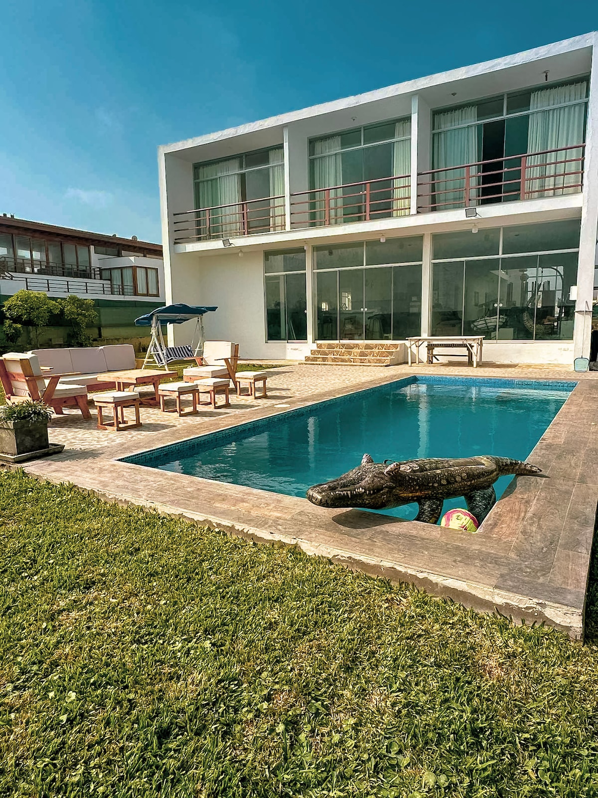 Solo para familias. A 8 minutos del Boulevar de Asia. Solo se permiten 14 personas. La casa cuenta con 5 cuartos, 6 baños, terraza en el 3er piso con piscina, sol y sombra y zona de parrilla. Cocina, horno, refrigeradora, terma, lavadora, televisores con cable y artefactos eléctricos. Estacionamiento propio. Estacionamiento para invitados dentro del condominio sujeto a disponibilidad. No están permitidas las mascotas. Se proporcionan sábanas. No considera toallas, jabón, champú o detergente.