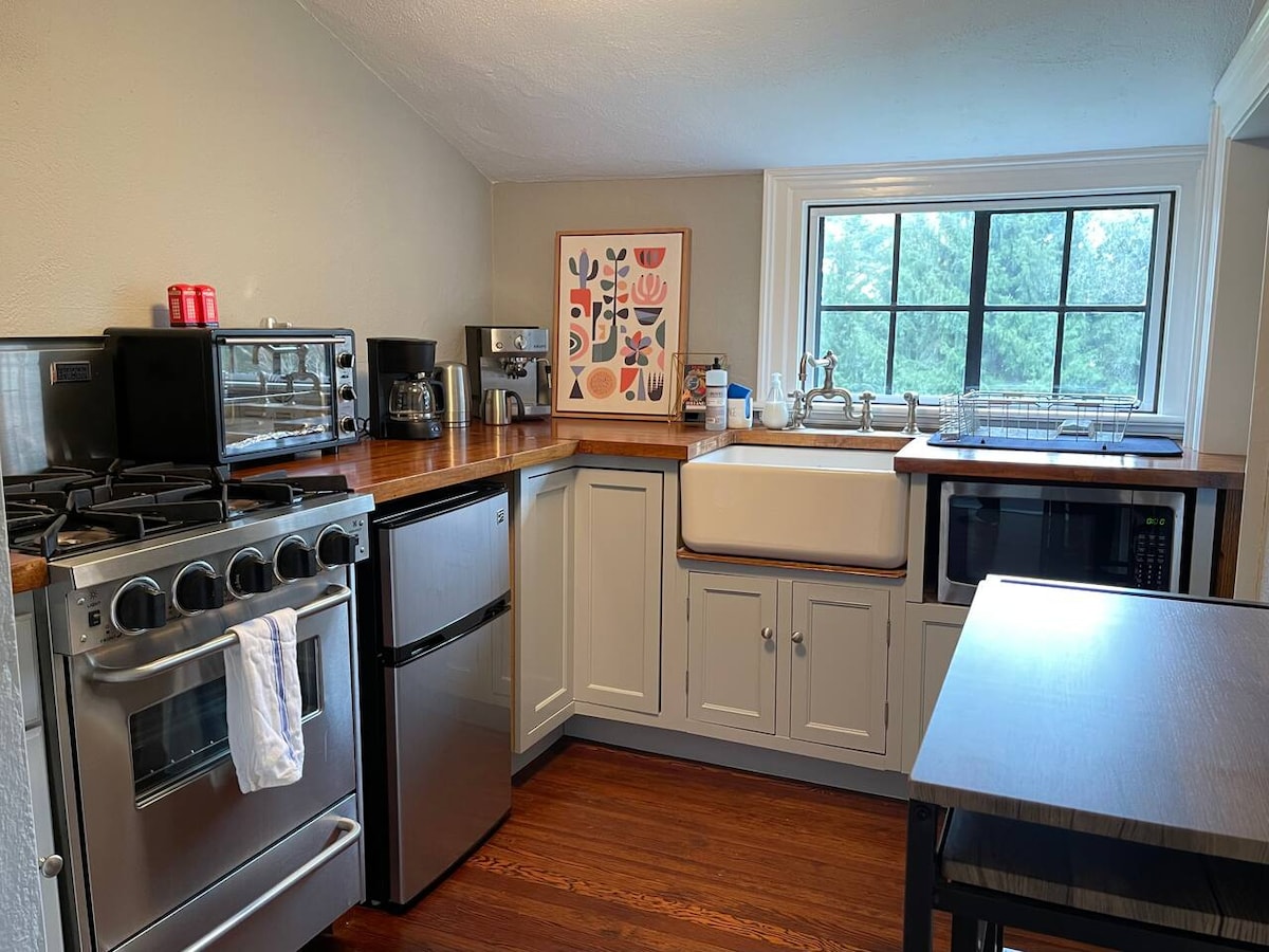 Okouzlující apartmán pro hosty na našem pozemku o rozloze 1,5 akru v idylické čtvrti, 7 minut do centra Wiltonu a 8 minut do centra Westportu. Chata je vhodná pro 1–2 dospělé, vejde se do ní 3 osoby, pokud je jednou z nich dítě. Jednotka je oddělena od našeho domu, spojena s ním je krytým spojovacím průchodem, nad garáží. Je to kuriózní a útulné. Mezi luxusní kuchyňské spotřebiče patří plynový sporák, mini lednička, mikrovlnná trouba a mini myčka nádobí. V ložnici je manželská postel. V obýváku máme nafukovací matraci pro dvě osoby.
