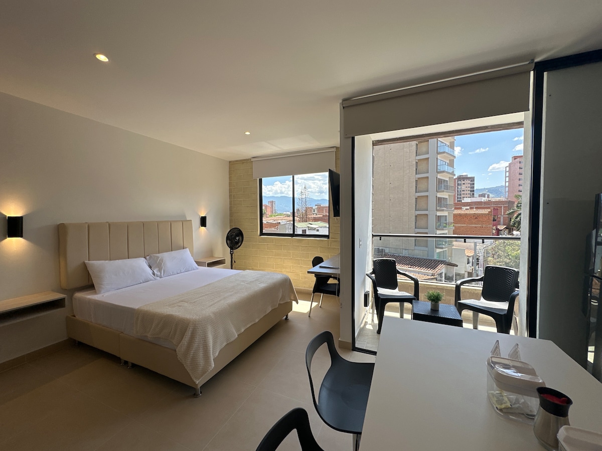 Enjoy a cozy and modern space in the heart of Laureles. This stylish loft is perfect for a relaxing short stay in Medellín. - Comfortable bedroom with a double bed, white linens, and clean towels ready for your arrival. - Workspace and table for two with wine glasses and a cozy atmosphere, ideal for you. - Strategic location near Avenida 70, with easy access to restaurants and shops in Laureles. Perfect for travelers seeking comfort and simplicity.