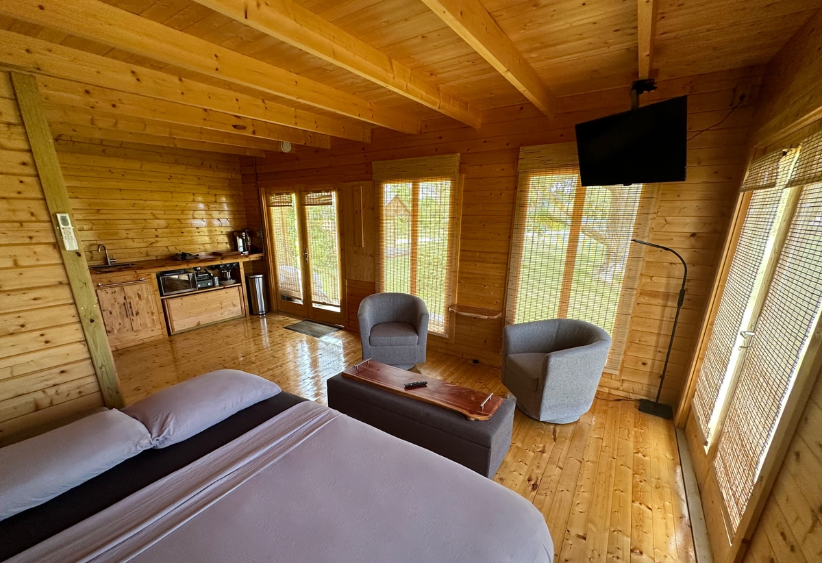* ŽÁDNÝ POPLATEK ZA ÚKLID * Tato moderní, útulná malá chata, která se nachází na malé rustikální farmě pod obrovským 400 let starým pobřežním dubem, má vše, co potřebujete pro klid a pohodu. Jeden akr klidného, stinného, soukromého venkovního prostoru zahrnuje ohniště, venkovní kuchyni, piknikový prostor a výhled na jemně pasoucí se hospodářská zvířata. Uvnitř chaty se budete cítit hluboce uvolněni, obklopeni okny a voňavým severským smrkem, který tvoří otevřený půdorys kolem vás.