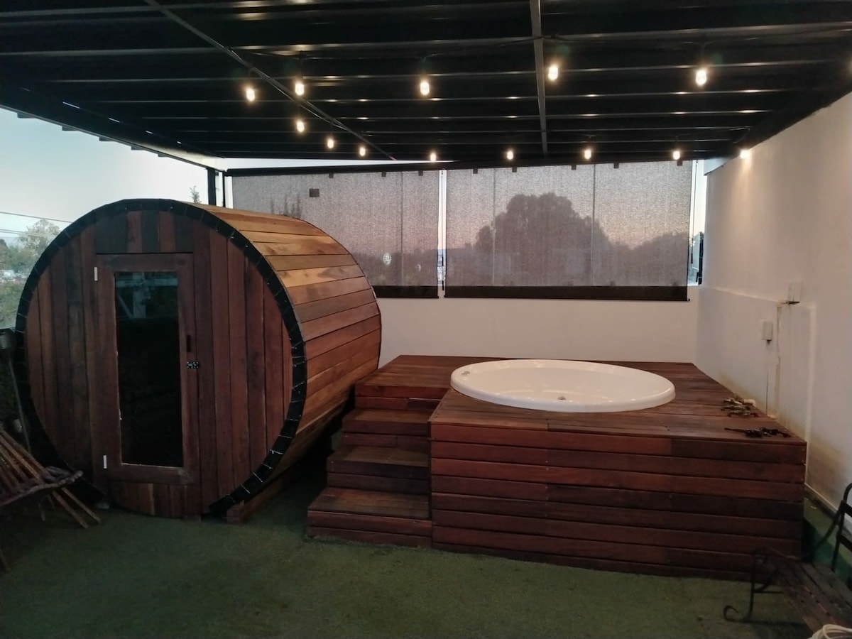 cabaña rústica en roof garden con jacuzzi adentro