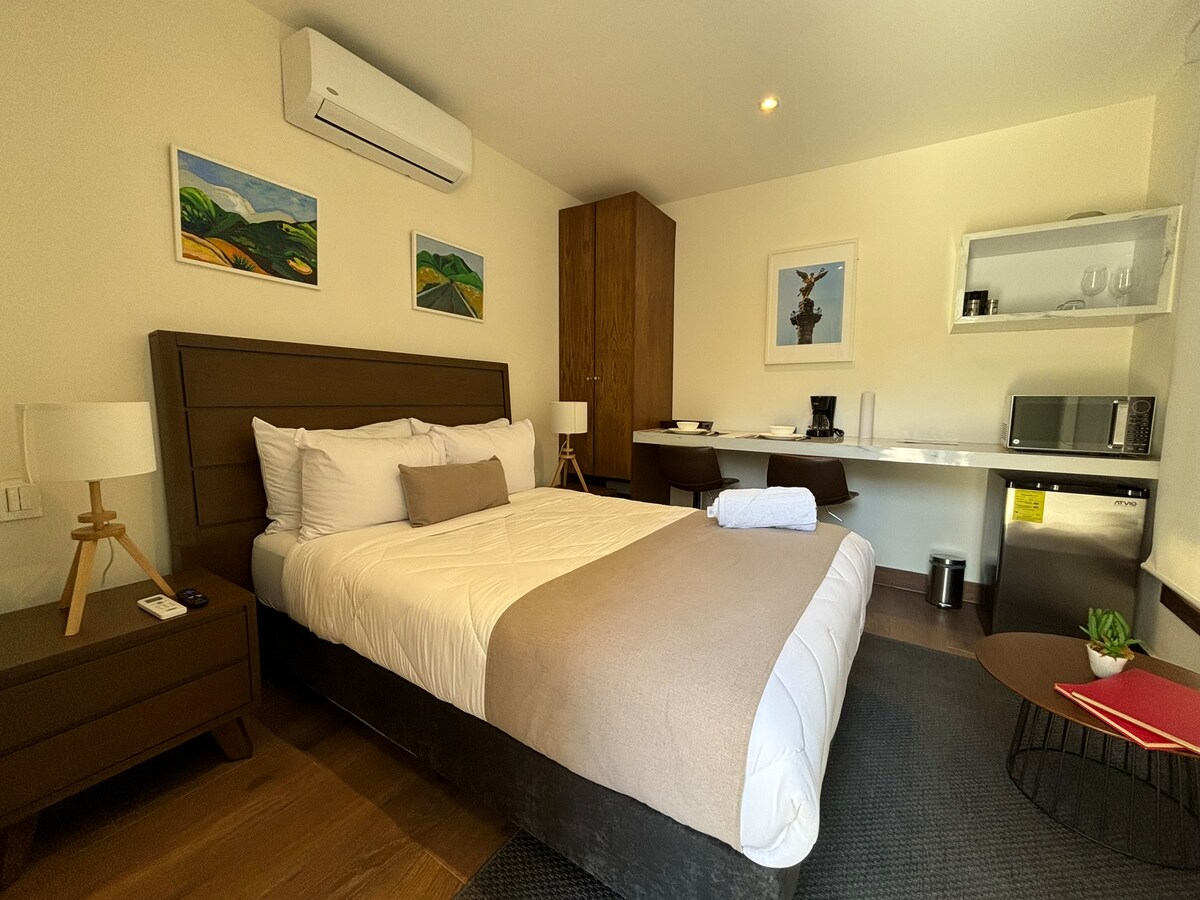 Our Suite has a king bed, equipped kitchenette, TV room (Smart TV), private bathroom, designer furniture, high-speed internet, air conditioning, in a great location between Paseo de la Reforma, Zona Rosa and the Roma and Condesa colonies, which are the center of the city's most vibrant life with all the communication avenues, Metro, Metrobus, Turibus, Taxis.