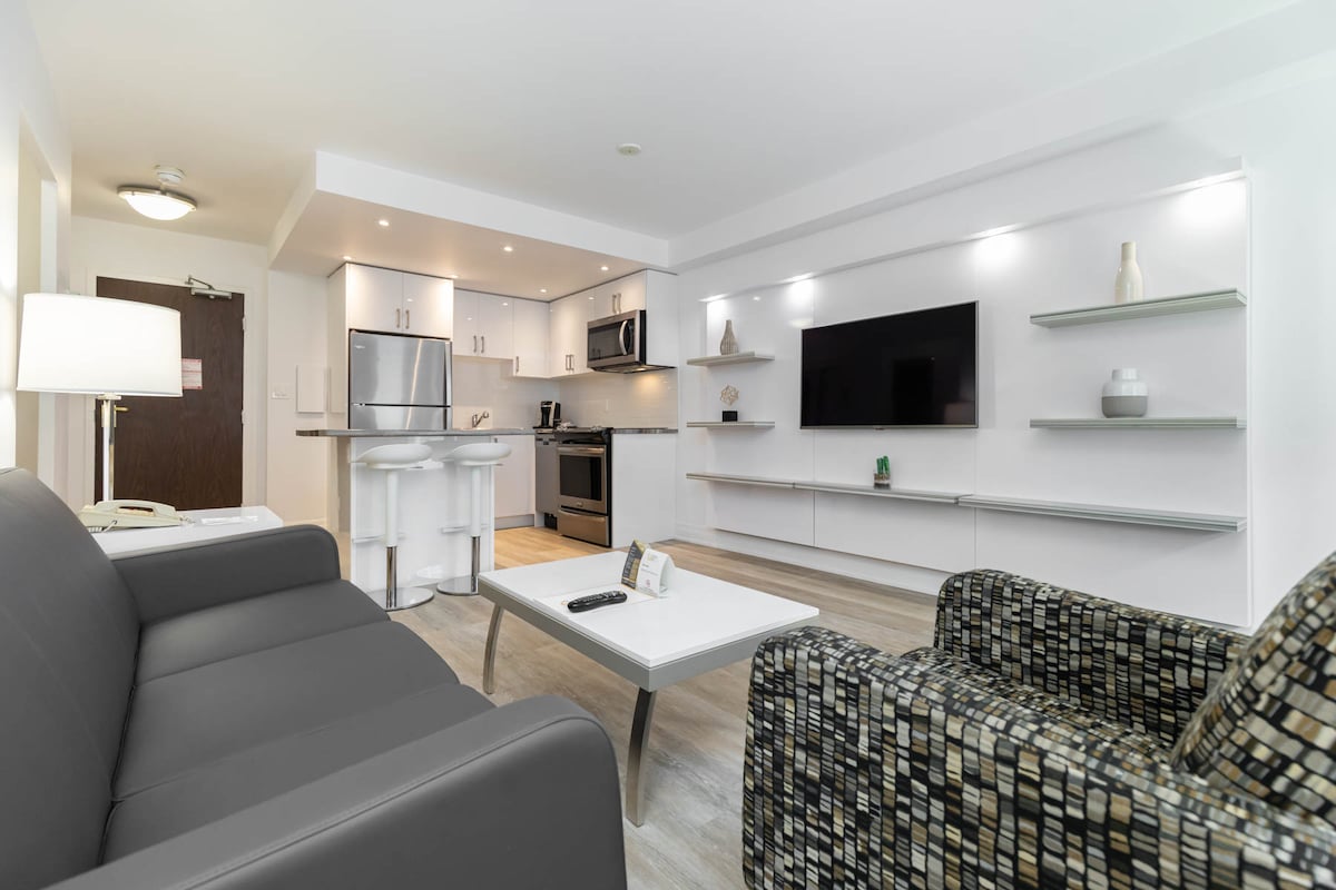 Objev své městské útočiště v tomto prostorném pokoji o rozloze 500 čtverečních stop v centru Toronta, jen pár kroků od Yorkville. This suite features a king size bed, fully equipped kitchen, ideal for meals, along with a separate living area filled with natural light and a cozy dining space. Užij si soukromí oddělené ložnice a dobře vybavené koupelny. This is the perfect place for extended stays, just a 5-minute walk to the Yonge-Bloor metro station—ideal for exploring the city!