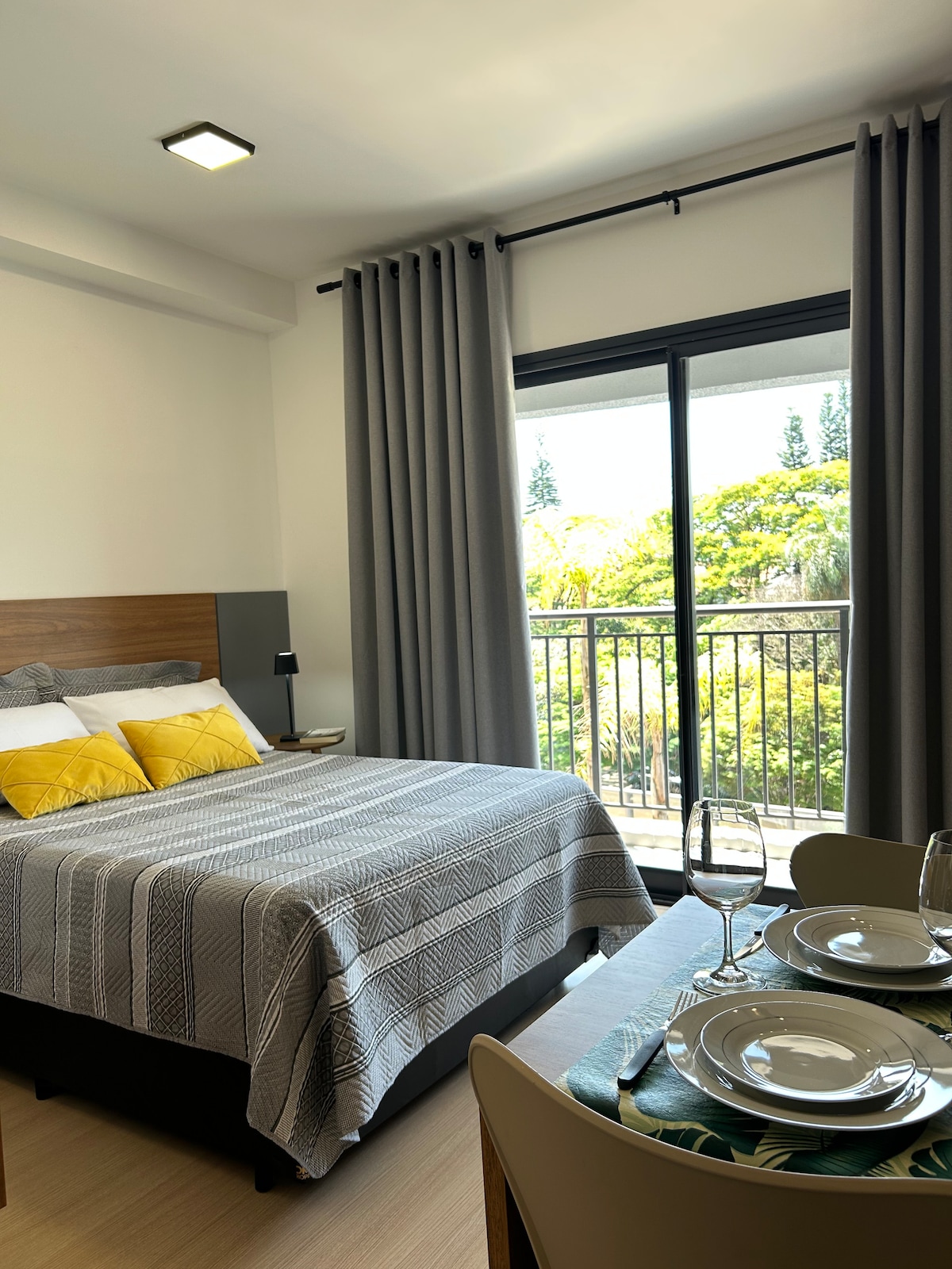 Náš 23 m² studio je ideální až pro 2 osoby, nabízí manželskou postel v útulném a funkčním prostředí s krásným výhledem. Kondominium má kompletní rekreační zónu (bazén na střeše, hernu a saunu, povolené pro pobyty delší než 3 měsíce), obchod s potravinami v přízemí a 24hodinového vrátného. Byt se nachází jen jeden blok od stanice metra Adolfo Pinheiro (linka 5 - Lilac) a v blízkosti univerzity Santo Amaro, což poskytuje mobilitu a praktičnost pro váš pobyt.